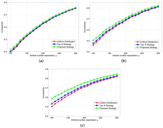Connectivity under different allocation strategies. (a) number of RSUs ; (b) number of RSUs ; (c) number of RSUs .