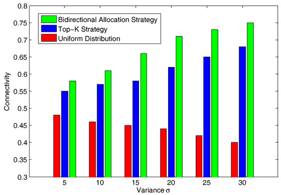 To analyze the impact of vehicle distribution, we will compare the connectivity of these strategies under the vehicle distribution variation. Here, we have the number of vehicle expectation with variance from 0 to 30 in Figure 10. When , the traffic flow is uniformly distributed among all the regions. In this situation, the performance gap among RSU allocation strategies is minor. As the variance increases to and , we can see that both our proposed strategy and Top-K strategy have greatly improved connectivity, and our proposed strategy obviously has better performance. Meanwhile, the performance of the uniform distribution strategy deteriorates as the variation increases. Furthermore, as the variance continues to increase at and , the connectivity begins to converge in this period, and the performance gain between our proposed strategy and Top-K strategy is minor. We can conjecture that when the traffic density is low and uniform, both our proposed bidirectional allocation strategy and Top-K strategy would make similar decisions to allocate the RSUs in the region with higher vehicle density.