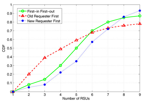 In this section, we will evaluate the system performance for a general case scenario, in which the vehicles can join or leave the system anytime and anywhere, and the request demand can only be redirected to the passing-by RSUs under the connection capacity limitations. We consider that the number of vehicles to join or leave between every pair of RSUs follows a Poisson distribution at each time slot. The online strategy including replication scheduling and request scheduling is implemented to deal with the time-varying traffic flow. Specifically, we consider three types of mechanisms (i.e., First-in First-out, Old Requester First, and New Requester First, respectively) in request scheduling. We compare the cumulative distribution function (CDF) of a completed request with different numbers of passing-by RSUs under these mechanisms in Figure 12. Generally, all three of these mechanisms would have an increasing CDF as the number of passing-by RSUs grows. Compared with First-in First-out and New Requester First mechanism, Old Requester First has a fast CDF increase with a limited number of RSUs, as the vehicles passing-by previous RSUs would be served in priority. Nevertheless, the CDF increase of Old Requester First becomes slow as the number of passing-by RSUs keeps growing. On the contrary, New Requester First would have a slow CDF increase initially, and a fast increase can be observed with an increasing number of RSUs. As New Requester First serves the newly joint vehicles in priority, it is suitable for more RSUs allocated. During the real-world implementation, these request scheduling strategies can be flexibly adjusted according to the RSU distribution and traffic condition.
