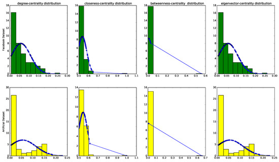 We simulate the Facebook graph using the Barabási–Albert model, which generates 87,516 edges for 4000 nodes. Similar to the Facebook dataset, we divide the Barabási–Albert graph into 10 ego-networks. The community library in Python [49] properly clusters the graph into several communities. We consider the node with highest betweenness as ego for each subgraph [17]. For further investigations, we compare degree, closeness, betweenness and eigenvector centrality distribution between one ego-network of the Facebook and one from the artificial graph. Figure 1 demonstrates centrality distribution of two random egos; ego ’686’ of the Facebook and ego ’25’ of the artificial dataset. We then require a metric to measure whether two distributions are identical. The Kolmogorov–Smirnov test [50] is the most popular test to find identical distributions. Therefore, we consider pairs of egos with similar size (number of edges) and use the Kolmogorov–Smirnov test. The Kolmogorov–Smirnov test generates two key values: KS statistic and p-value. If the KS statistic is small or the p-value is high, then the distributions of two samples are the same. Table 2 describes details for pairs of ego-networks that have nearly the same number of nodes. For all pairs, distributions are similar since KS statistic is low (around ) and the p-value is higher than [50].