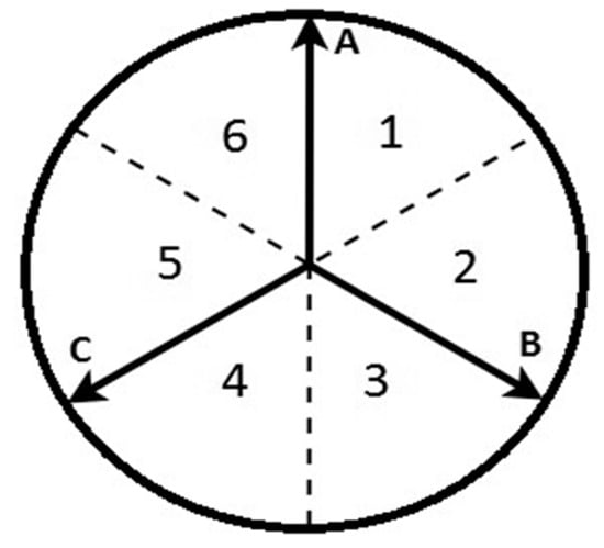 These basic concepts of a BLDC motor help to understand the control structure. The alternating electromagnets producing a rotating space vector. This vector is calculated by following the method proposed as follows. This method reduces the computational time. Figure 3 shows that one electrical rotation is equal to six parts, where A, B, and C are voltage vectors. If both B and C are zero, and voltage A has a value of 255, the resultant vector points in the direction of A. In order to operate in an area, the maximum PWM value is assigned to voltage A, while C is turned off and B can be varied. Table 1 shows the phases used to operate in a particular area. This method shows that every electrical rotation is divided into six parts, and every part can be further divided into 255 steps. Therefore, every electrical rotation consists of 1524 steps (eliminating double scenarios). Hence, a mechanical rotation consists of approximately 10.660 steps. Each step covers nearly 0.03 mechanical degrees.
