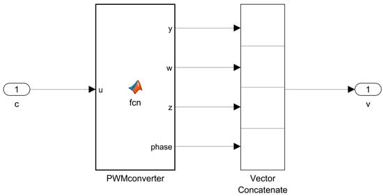 The PWM converter is implemented using Equations (2)–(7) in a MATLAB function. The right equation is selected by using if else statements in MATLAB Programming, and the corresponding PWM values are determined. The input of the function is the controlled angle of the BLDC Motor, and the output is a vector containing the PWM values and the phase corresponding to these values. In Figure 4, the PWM converter subsystem is shown.