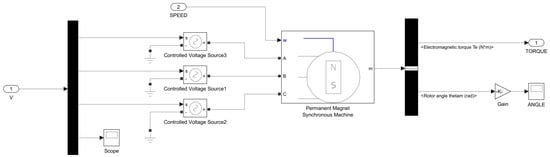 The model of the DC motor is a bit more complicated, as can be seen in Figure 5. The PWM converter generates PWM signals for the motor to control the voltage provided to the BLDC motor. The PWM-based control of the voltage is done using the Controlled Voltage Source block in Simulink, with source type DC and initial amplitude zero volts. The input is the PWM value of the PWM converter, the minus side is connected to the ground, and the plus side is the output voltage, which is connected to the DC motor. In this research work, a Permanent Magnet Synchronous Machine (PMSM) is used as DC motor in Simulink. The configuration of the PMSM is standard with three phases, a trapezoidal back Electromotive Force (EMF) waveform, and speed as mechanical input. Since no parameters of the DC motor are known, the parameters of the PMSM are also standard and thus remain unchanged. In Figure 5, N and S shows the North (N) and South (S) pole respectively.