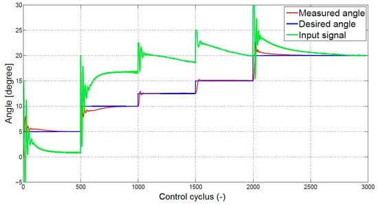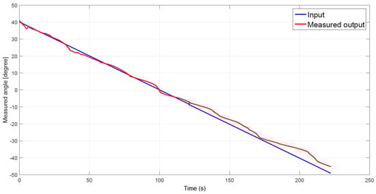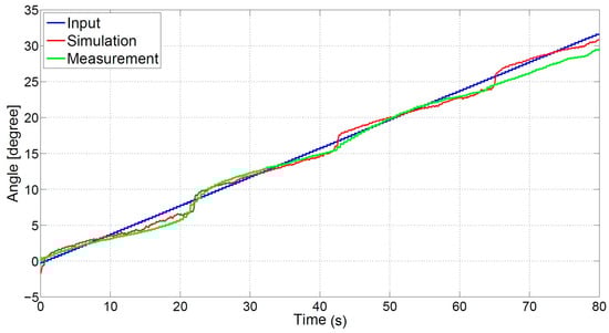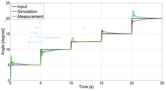 The closed-loop measurements and simulations are compared using the same PID controller. The values of the PID controller are determined by using the Ziegler–Nichols method, and are respectively 0.2647, 1.7647, and 0.0099. Figure 12 shows the simulation and measurement data. As seen with the open-loop simulation, for small angles the simulation and measurement data are approximately the same. For larger angles, the simulation and measurement data differ more.
