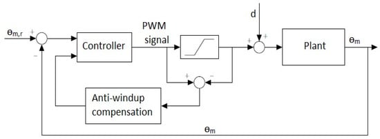 After implementing the closed-loop control algorithm, without a controller, on the Arduino and testing it on a single motor, severe unstable behavior is seen. Therefore, a PID controller, which is commonly used in the industry, is proposed []. The control scheme for a BLDC motor can be seen in Figure 7. In this scheme, is the desired mechanical angle, while is the actual measured angle. Since a PID controller is used, anti-windup compensation ensures no integral windup will occur. Note that, normally, cascade control is used to control the position of a PMSM.
