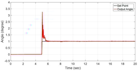 After manual tuning, the Ziegler–Nichols closed-loop tuning method is adopted instead of a trial-and-error method. The Integral and Derivative are neglected in this method, and it is used only as a gain of control. After implementing the PID controllers, a step response for the BLDC motor is shown in Figure 9. As can be seen in the Figure 9, the angle is still vibrating with huge overshoot. In the next section, the simulation and experimental results of both the open-loop and closed-loop are compared.