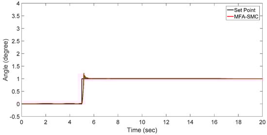 An analysis shows that is quadratic convergence and that the and values are present in the control law; thus, the MFA-based adaptive SMC is greatly improved. It can be seen that Equation (27) has a discontinuous function. This function will establish a high frequency chattering at the sliding mode surface. This high frequency will reduce the performance of the control system, and cannot be applied to an actual control system. To eliminate the high frequency chattering, replace with the function in Equation (27). By replacing the above function, it will convert the discontinuous function of the continuous signal that will result in a reduction of the chattering effect.