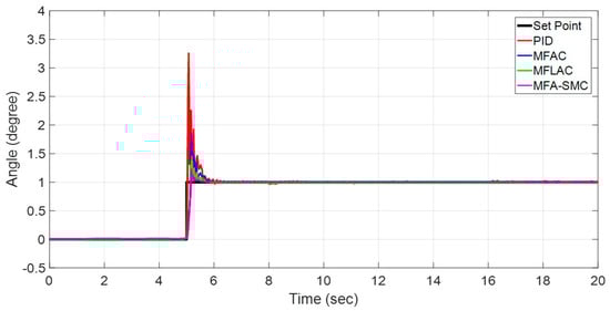 Figure 17 shows the step response of the BLDC motor. Table 2 summarizes the performance analysis of the different control algorithms. Table 2 shows that Conventional PID has a Maximum Overshoot of 3.26, a settling time of 1.251, and a rise time of 0.021. Similarly, MFAC has a Maximum Overshoot of 1.85, a settling time of 0.822, and a rise time of 0.134, and it is better than conventional PID. In addition, MFLAC has a Maximum Overshoot of 1.46, a settling time of 0.691, and a rise time of 0.137. The MFLAC result is much better than PID and MFAC. However, the proposed MFA-based SMC control is greatly improved, with a Maximum Overshoot of 1.21, a settling time of 0.492, and a rise time of 0.146. Although there is only a slight improvement in the rise time, the overshoot and settling time is greatly improved and is better than PID, MFAC, and MFLAC.
