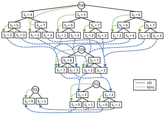 We note that once the values are found for a given tree , it is easy to compute the pointers for the internal nodes in a bottom-up fashion. Thus, we can apply dynamic programming to find the h and b values for each job configuration tree in order, beginning with . An optimal schedule can be found by following alternating b and c pointers, starting with . The peak height of this schedule will be given by (the b pointers are also shown in Figure 2).