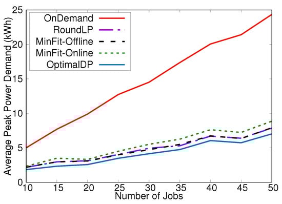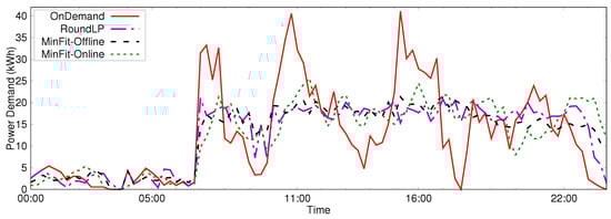 The second scenario we considered was the performance of the RoundLP, MinFit-Online, and MinFit-Offline algorithms with a large number of realistically generated jobs. Figure 4 shows the average power demand versus time of day for the OnDemand, RoundLP, MinFit-Online, and MinFit-Offline algorithms when scheduling 100 instances of 500 jobs over a 24 h period. The peak demands in k Wh were for OnDemand, for RoundLP, for MinFit-Offline, and for MinFit-Online.