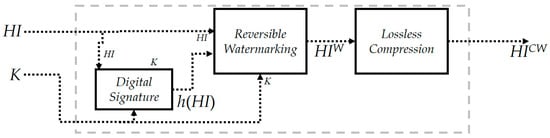 After that, the watermarked hyperspectral image HIW (i.e., the output of the reversible invisible watermarking scheme) is compressed by using an efficient lossless compression algorithm. The output of this compression stage, is denoted as HICW and it can be efficiently transmitted.