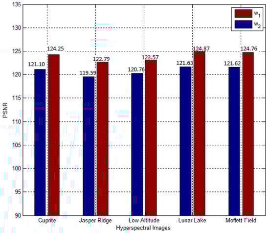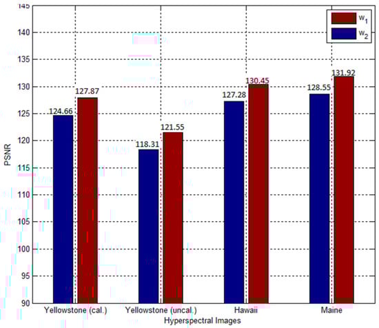 In Table 5 and Table 6, the achieved simulation results are reported, in terms of the PSNR metric by embedding the watermark w1 and the watermark w2, respectively. The value assumed by the PSNR metric is reported for each scene (first column) of the Yellowstone calibrated (on the second column) and uncalibrated (on the third column), Hawaii (on the fourth column), and Maine (on the sixth column) hyperspectral images.