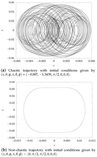 The system does exhibit both chaotic and stable regions for the time span herein studied. There are three characteristic times in this system: s and s (when oscillating pendula are initially dropped from ). As an illustrative issue, we show phase planes for x, for chaotic and a non-chaotic cases, in Figure 1. The initial conditions for the chaotic trajectory are given by: . Meanwhile, for the non-chaotic trajectory the initial conditions were: .