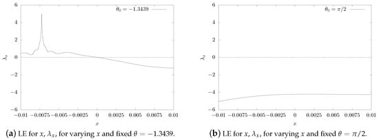 In Figure 2, Lyapunov exponents for varying x and fixed are shown. The chaotic phase plane trajectory shown in Figure 1a has a Lyapunov exponent, , that corresponds to that of Figure 2a with . On the other hand, the non-chaotic phase plane trajectory shown in Figure 1b has a Lyapunov exponent, , as shown in Figure 2b with