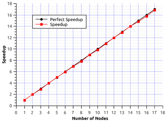 Speed-up obtained in the cluster. The perfect speedup is 17 and the obtained speedup is 16.85, giving us a very good performance.