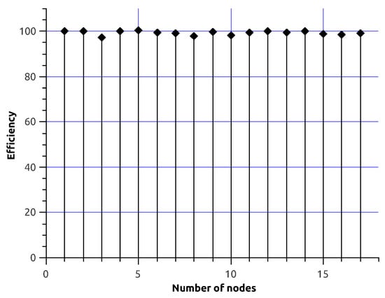 where is the obtained speed-up with n processes, and indicates how busy are the nodes during execution. Figure 6 shows that the efficiency obtained is high, since on average every node is kept busy 99.3% of the time. The efficiency also indicates that the partitioning of tasks herein implemented is scalable, which means that we can increase the number of computing units to improve time reduction while not losing efficiency in the use of many nodes. The scalability must be contemplated as a good design of the parallel program, since it allows scaling of the algorithm, a fact that we could expect when increasing the number of processing units in the cluster. Similar implementations where the problem consists of processing recursively the first, second, third, and fourth Runge–Kutta coefficients in a parallel fashion, achieve a maximum performance which decreases when adding more processing units [19].