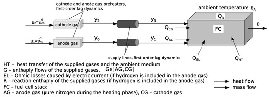 Note that including dynamic representations for the preheaters instead of replacing their behaviour by measured values is preferable for the design of controllers which take into account the thermal system model as a whole. After the introduction of suitable sample and hold elements, the Equations (5)–(8) could still be used in a piecewise constant way; however, the difference to the “true” solution of the Riccati equation would be considerable. To identify the parameters for the preheaters and the stack together and to study the usefulness of such a variant is a topic for the future research.