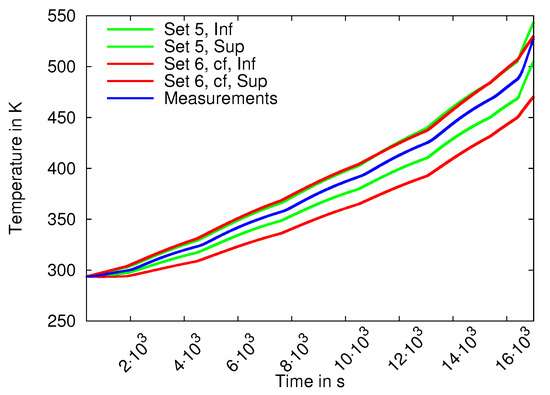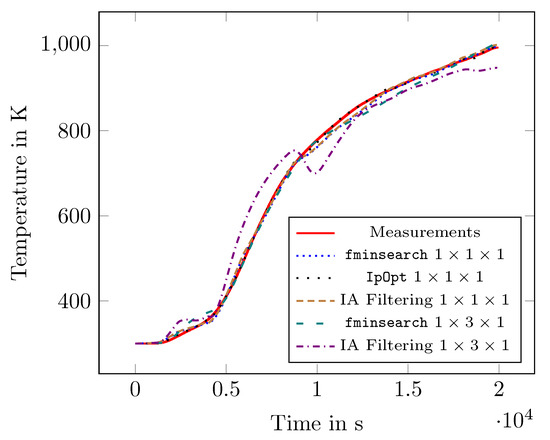 In most of our recent publications (e.g., [7,28]), we solved the global optimisation problem in Equation (2) by verified approximation ((i.b) with (ii.b)): The true solution of the IVP was approximated by the explicit Euler method in its interval version taking into account numerical errors but not the discretisation error as , where f denotes the right-hand side of the IVP (componentwise). The interval approximation at was substituted for the exact solution in the cost function in Equation (2) and the discretisation error ignored. In our setup, the sampling time s is by at least two orders of magnitude smaller than the dominant time constant of the thermal process, that is, was an acceptable approximation of the true solution . Although we could not verify the whole process by applying interval optimisation procedures in this case, the approximated cost function