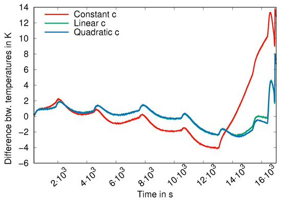 A comparison of simulated temperatures delivered by MPQ1, MPL1 and MPC1 in Figure 3 shows that the model with linear heat capacities has the best accuracy (cf. also Table 3). The simulated and measured temperatures themselves are shown in Figure 4. Surprisingly, the MPL1 simulation results are even better than those of MPQ1 (which are obtained at higher computing times). Generally, the optimisation in two runs and with measurements for the preheaters delivered better parameter sets for MPC1 than the optimisation with the weighted sum in Equation (17). This is the reason for the large difference between measured and simulated data for the option “Set 2” in Figure 4, left. However, the best parameter set for MPC1 is obtained by IPOPT relying on the exact solution (Variant (i.a), Set 3). The computing times are high in this case because we used IPOPT with the exact Hessian matrix obtained by (exact) algorithmic differentiation. None of the computed parameter sets using MPC1 could be proved to be consistent with respect to the condition in Equation (3) (). For MPL1, the accuracy is better than that for MPC1, and the computing times are comparable.