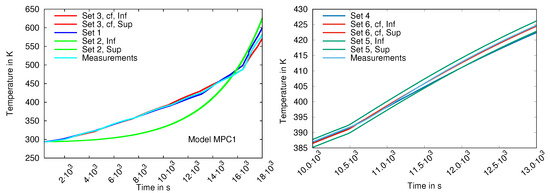 Simulated temperatures for different parameter sets (cf. Table 3) in comparison to measurements in case of MPC1 (left) and MPL1 (right). Since the curves are very similar for MPL1, we show only a plot close-up in the Figure. “Cf” means that the closed-form solution was used, otherwise VNODE-LP. A MATLAB solver was employed to identify the parameters from Sets 1 and 4. For parameters in Sets 2, 3 and 5, the solver IPOPT was used. The parameters for Set 6 are the same as for Set 5.