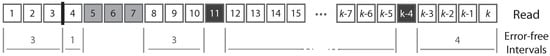 A read can be partitioned uniquely into maximal sequences of identical symbols referred to as “intervals”. Thus, reads can also be seen as sequences of either error-free intervals or error symbols (Figure 2). As detailed below, this will allow us to control the size of the largest error-free interval.