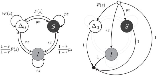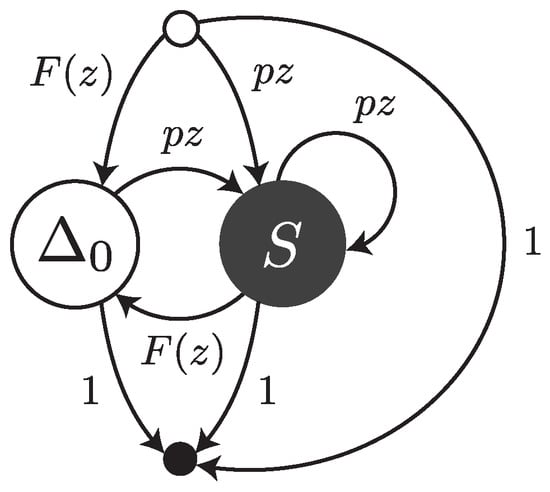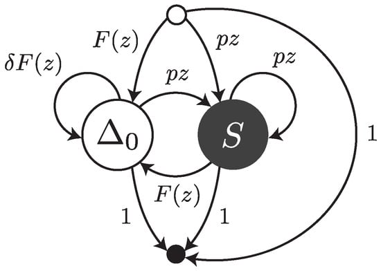 The hypotheses of Theorem 2 that there is only one dominant singularity and that it has multiplicity 1 are essential. Otherwise, expression (4) does not hold and other asymptotic regimes occur [] (p. 498, Theorem 4). One can show that the conditions of Theorem 2 are satisfied for the weighted generating functions described in the next section. Importantly, one can also show that, in every case, the root with smallest modulus is a real number greater than 1. This has the important consequence that we can search in the space of real numbers greater than 1 using numerical methods such as Newton–Raphson or bisection. The proofs of these statements are outside the scope of this manuscript; the key observation is that, in all the cases, the body of the transfer graph is irreducible and aperiodic in the sense of Markov chains [] (p. 341, Definitions V.5 and V.6). One can thus apply [] (Theorem V.7 p. 434 and statement V.44 p. 358) to the body of the transfer graph, which by Theorem 1 is the sole contributor to the asymptotic growth of the coefficients. We refer the interested reader to [] (pp. 336–58).