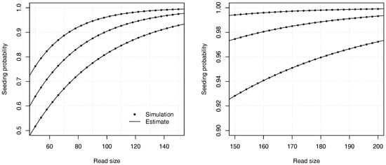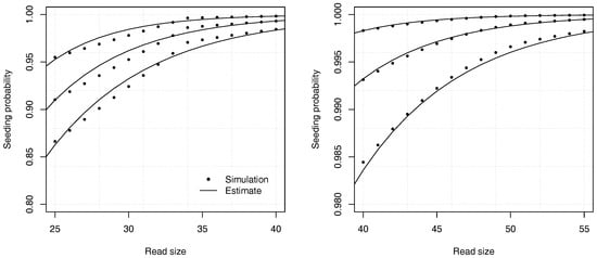 Example worst case for seeding with substitutions only. The analytic combinatorics estimates of Proposition 2 are benchmarked against 10,000,000 random simulations. Shown on both panels are the probabilities that a read of given size contains a seed of size , either estimated by random simulations (dots), or by Proposition 2. The curves are drawn for , or (from top to bottom). The largest difference between the estimates and the simulations is around .