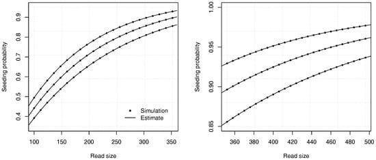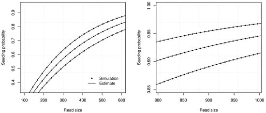 Example estimates for substitutions and deletions. The analytic combinatorics estimates of Proposition 3 are benchmarked against random simulations. Shown on both panels are the probabilities that a read of given size contains a seed, either estimated by 10,000,000 random simulations (dots), or by Proposition 3 (lines). The curves are drawn for , and , or (from top to bottom).