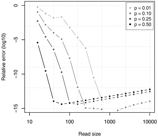 In spite of this artefact, it is clear that the relative error of the estimates remains low for very large read sizes. This means that the estimates are sufficiently close to the exact value, and that the calculations are numerically stable. Figure 10 also confirms that the value of p has a large influence on the convergence speed of the approximation. For high values of p, the relative error drops faster than for low values of p, as argued above.