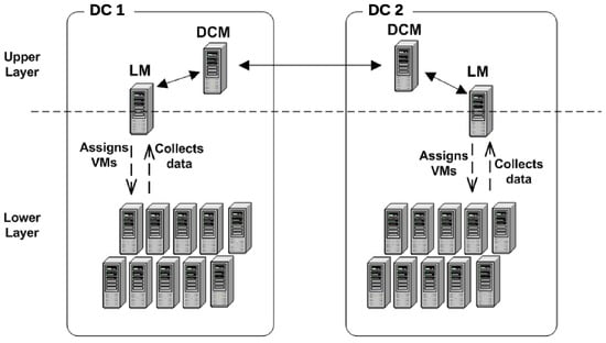 The reference scenario is depicted in Figure 1, which shows the upper and lower layers for two interconnected DCs. At each DC, a data center manager (DCM) runs the algorithms of the upper layer. The DCM integrates the information coming from the lower layer and uses it to implement the functionalities of the upper layer. The DCM communicates with the local manager (LM) and acquires detailed knowledge about the current state of the local DC, for example regarding the usage of host resources and the state of running VMs. Then, the DCM extracts relevant high level information about the state of the DC and transmits this high level information to all the other DCMs (upper layer). The algorithms at the upper layer combine the collected information and make decisions about the distribution of the workload among the DCs. The assignment algorithm is used to decide to which DC a new VM should be assigned. Once the VM is delivered to the target site, the LM runs the lower layer algorithms to assign the VM to a specific host.