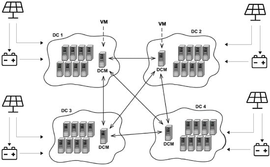 As shown in Figure 2, the scenario considered in this paper includes four DCs. The DCMs execute the upper layer algorithms by exchanging information among themselves. While the approach requires information exchanges that scale quadratically with the number of DCs, the number of interconnected sites is expected to be small. Moreover, the amount of information to be distributed is tiny, i.e., of the order of a few packets, since it contains only a general description of the status of the DC: only pieces of information such as the load, the PUE and the electricity price need to be exchanged. The periodicity of the information exchange is of the order of an update per one or a few minutes, meaning that less than 1 Kbps of information exchange is needed. Two basic algorithms are executed at each DCM: (i) the assignment algorithm that determines the appropriate target DC for each new VM; (ii) the migration algorithm that periodically evaluates whether the current load distribution is appropriate, decides whether an amount of workload should be migrated and, if so, determines from which source site to which target site.