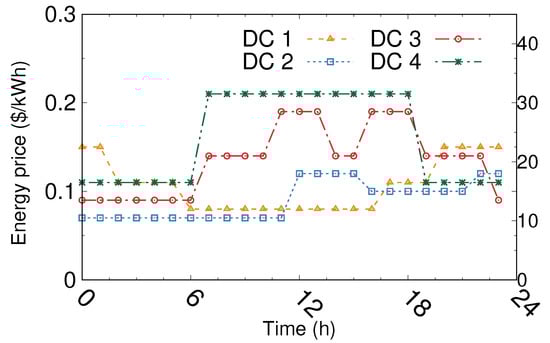 The scenario under analysis is the same as in [38,39], with four interconnected DCs and values of the PUE as reported in Table 1; time zones are also indicated with respect to UTC, assuming that the DC locations are, respectively, California, Ontario (Canada), the U.K. and Germany. Figure 4 reports energy prices in a 24-h interval; again, time is expressed in UTC. Energy prices are taken or extrapolated from the following websites: