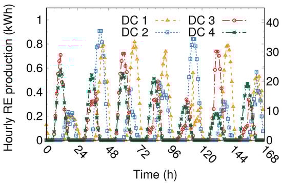 All the above-mentioned goals are important, yet different data centers may focus on different aspects, depending on the specific operating conditions and on the priorities prescribed by the management. It is up to the company’s management to specify the objectives and their relative weights. In this paper, the focus being the benefits of RE generation in multi-site DC operation and the associated reduction of operational costs, the algorithm uses information such as the amount of produced RE, the price of electricity taken from the power grid and the efficiency of the DCs.