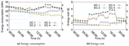 Figure 6 reports the hourly energy consumption and the hourly energy cost for each DC in a sample day. As can be observed from Figure 6a, the energy consumption of each DC showed a limited variability among DCs and during the day, with a minimum consumption level of slightly more than 50% the maximum observed hourly energy demand. Conversely, as can be evinced from Figure 6b, the energy costs varied much more over time and from DC to DC, due to energy price fluctuations. In particular, considering the time window from midnight to 6:00, despite similar energy consumption levels in the different DCs, the cost for the energy consumption showed huge variability over different DCs, with the range of variation being as high as 80% the maximum registered hourly energy cost. A proper VM assignment was hence required in order to place energy-demanding VMs on DCs where the energy price was lower.