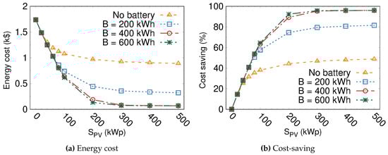 To understand the benefits of RE generation in the considered scenario, Figure 7 reports the weekly energy cost (Figure 7a) and cost-saving in percentage (Figure 7b) for several cases in which different values of the PV panel size and battery capacity were considered. Clearly, as the PV panel size increased, the amount of produced RE increased, and energy cost decreased. However, the advantages that were large for small RE plants reduced when a condition was reached such that most of the power supply was provided by RE. No additional saving was possible by increasing the PV panel size. Battery capacity had a similar impact. Large values of batteries allowed a better utilization of the produced RE. Once battery capacity was such that all the produced RE was used, no additional advantages could be achieved by using larger values of the battery capacity. Considering that the yearly energy cost was of the order of more than 90,000 $ in this scenario with four DCs, the cost saving may achieve more than 80,000 $ per year. Furthermore, since DCs can be composed of thousands of servers rather than just one to a few hundred, this saving might be as high as 5.5 million $ per year. Since 1 kWp corresponds to 5 m of PV panels, the case reported in the figure corresponded to quite large areas (around 1000 m for the 200 kWp case). This is a potential limitation to the adoption of RE, whose feasibility strongly depends on the environment in which the DC is located.