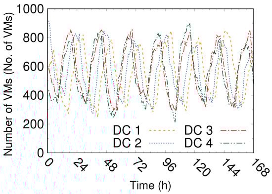 Results were obtained for a total load = 50%. Since the RAM was the bottleneck resource, the overall load of the system was defined as the ratio between the total amount of RAM utilized by the VMs and the RAM capacity of the entire system. Thus, the overall number of VMs was chosen so as to load the whole system to the desired extent. VMs were assumed to be launched at different rates during the day and the night, namely and , and that , with an average lifetime of 5 h per VM. When the VM migration algorithm was applied, the value of each DC was checked every hour, and workload migration was triggered when values of two DCs differed by more than 3%.