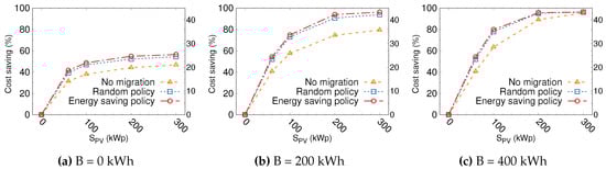 Cost-saving versus PV panel size for different migration policies; battery capacity equal to 0 kWh, 200 kWh and 400 kWh.