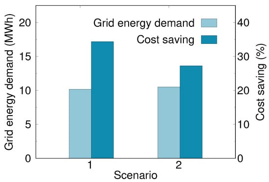 Cost-saving and total grid energy demand for the scenarios 1 and 2 reported in Table 2.