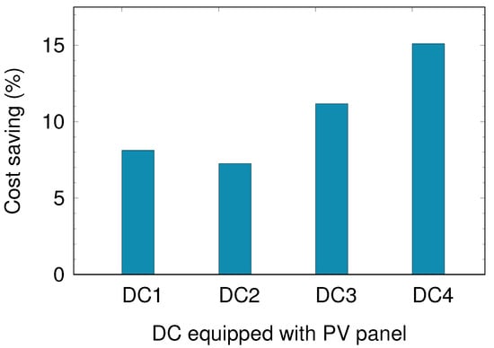However, price also should be taken into account. To further investigate the PV panel distribution strategies, Figure 11 reports the savings that can be achieved when the PV panels are installed in one DC only, according to what is reported in the x-axis. Observe that cost-saving does not only depend on PUE, but it depends also on the price of electricity, which is, on average, 0.1, 0.09, 0.14 and 0.16 $/kWh per each of the DCs. The lowest saving of about 7% was obtained by placing the RE generator where the average energy price was the lowest, i.e., 0.09 $/kWh, with an intermediate value of PUE. Slightly higher cost-savings were obtained by placing the PV panel in DC 1, having a similar average energy price and a slightly lower PUE with respect to DC 1. By placing the PV panels in DC 4, showing the highest average energy price (77% higher than for DC 1) and value of PUE, cost-saving results more than doubled. This behavior is partly due to the variability of energy prices over time and the location-dependent RE production levels. Indeed, the average daily RE production varied depending on the location, being 4.2, 3.7, 3.2 and 3 kWh per kWp of PV panel capacity in each of the different DC locations, respectively.