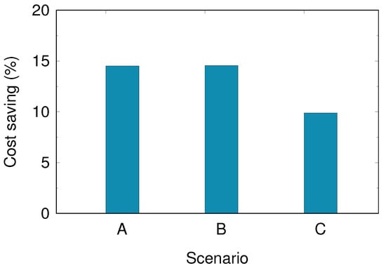 Finally, the effects of PV panel capacity consolidation is analyzed in Figure 12, which shows the cost-saving obtained in three different scenarios having the same total PV panel capacity of 80 kWp. In Scenario A, each DC was equipped with a 20-kWp PV panel; in Scenario B, two PV panels with a capacity of 40 kWp were installed in two DCs; in Scenario C, an 80-kWp PV panel was installed in a single DC. The different scenario configurations are reported in Table 2. For Scenarios B and C, the DCs equipped with PV panels were selected considering the configuration providing the highest cost-saving. Consolidating the RE generation capacity in 50% of the DCs allowed achieving the same cost-saving of almost 15%, which was obtained by distributing the RE generation capacity among all DCs. Conversely, if the same PV panel capacity was located in a single DC, only 10% of the energy bill could be saved. Hence, given the same initial investment for installing a PV panel system with the desired capacity, it was more convenient to select a limited number of DCs to be powered with RE, rather than equipping all DCs with some PV panels.