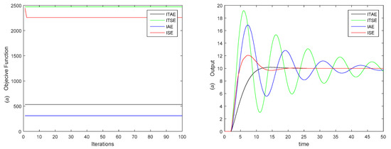 As mentioned above, any objective function can be adopted to tune the PID parameters. However, it is hard to reduce the rise time without increasing overshoot. By reducing the rise time, the system will try to follow the set-point faster, which will produce a greater inertia, thus raising the chance of an increased overshoot. As can be seen in Figure 4, although the response signal of ITAE declines faster, the convergence velocity of ITAE is obviously the best one compared with the other methods. Note that the integral absolute error (IAE) provides the best convergence, but its time response (overshoot, rise time, and settling time) is not optimal. Thus, in all cases (number of iterations), the integral time absolute error (ITAE) provides the best solution.