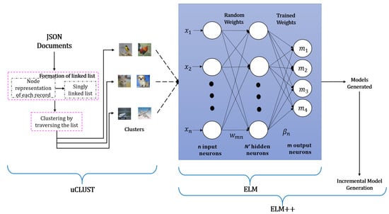 CUIL is designed in such a way that it classifies the unstructured data by combining two methods—uCLUST [12] and ELM++. CUIL provides uCLUST with the following inputs: clustering attributes and image metadata, which is in JSON format. This format is chosen over other formats like csv, xls as JSON supports unstructured format i.e., the fields of the records can be unordered. uCLUST segregates the unlabeled images into clusters by clustering the metadata based on the given attributes. Each image gets assigned to a cluster receiving a class label. These image metadata come in batches and images belonging to each batch gets clustered and assigned with a class label. The labeled images received from uCLUST is given as input to ELM++, which incrementally creates a model for each batch. For example, if they are n batches, then n models are created and these models are used for classifying the upcoming unlabeled test data. Figure 2 shows the architecture of CUIL, detailed explanation about uCLUST and ELM++ are available in Section 3.2 and Section 3.3 respectively.
