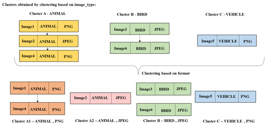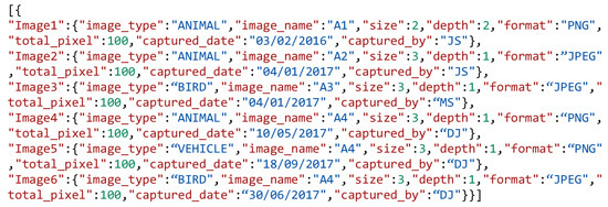 A sample JSON document consisting of the image metadata is given as input, refer Figure 5 which has the following attributes: {image_type, image_name, size, depth, format, total_pixel, captured_date, captured_by}. The attributes image_type and format are accounted for clustering. The former attribute has four values: ’ANIMAL’ or ’BIRD’ or ’VEHICLE’ or ’OTHERS’ and the latter has two values: ’PNG’ or ’JPEG.’