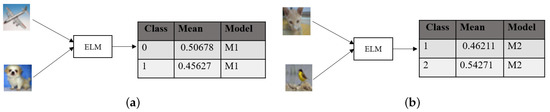Figure 8 shows the individual model created by ELM for each batch. After learning and creating the models for two batches (batch A, batch B), ELM++ creates two objects which contains three attributes ’class, mean and model’ values. When a test image arrives, its intensity mean is calculated and is checked with the values available in stored objects. As in Figure 9, consider if the mean of the test image is 0.53209, ELM++ checks the attribute value (mean) of the objects and based on the threshold value (0.01), it chooses a model whose difference in intensity is ± threshold from the image intensity. So, for test image , it classifies the image with model M2 since the class intensity mean of the model is 0.54271, which lies between the range (0.53209 ± threshold). Similarly for test image , if the intensity mean is 0.44372 and threshold = 0.01, ELM++ classifies the image using both models M1 and M2 since they have a class intensity mean of 0.45627 and 0.46211 respectively, which lies within the range (0.44372 ± threshold). The classified results of by both the models M1 and M are combined using Algorithm 6.