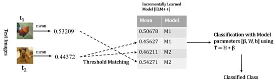 After creating the trained models incrementally, ELM++ classifies the upcoming unlabeled test images by combining the generated models. Algorithm 5 explains the procedure of choosing the right model for classifying the test images. ELM++ chooses a model for finding out the class labels of the test images by comparing the intensity mean of the test image with the stored intensity mean of each trained class. If the difference in the intensity means of the test image and a class is less than a defined threshold, then the test image is classified with the model with which the corresponsing class was trained. Sometimes, an image may be classified using more than one model, i.e., the intensity mean of the test image may be less than the intensity mean of more than one trained class. In such cases, the test image is classified with all the models corresponding to the matched classes. The classified results of all the models are combined using Algorithm 6.