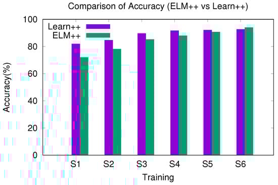 Scenario 1 creates a metadata for the standard dataset MNIST which is clustered using uCLUST and compares the performance of ELM++ with existing incremental learning algorithm Learn++ [31]. MNIST dataset contains 10 classes representing digits 0-9. Metadata is created for the dataset with attributes image_type, height, width, number. This metadata of images is given to the clustering algorithm uCLUST which clusters these images into 10 labeled clusters. Later, these labeled clusters were divided into 6 training sets (S1–S6) and 1 test set Each train set holds images belonging to classes 0 through 9, with 200 images in each class. Train set S2 will hold different images from S1. Train set S3 will hold images that are not present in S1 and S2, and so on. Test set contains images from all these 10 classes. Each train set was trained incrementally using ELM++ to create an individual model. When the test set is classified using the model creates by S1, an accuracy of 72% is obtained. When the test set is classified by combining models S1 and S2, the accuracy increases to 78.2%. By combining all these models S1–S6, the classification of the test images gets increased to 94%. The performance of ELM++ was compared with the existing algorithm Learn++. Table 4 and Figure 10 shows the performance comparison between Learn++ and ELM++ for MNIST dataset