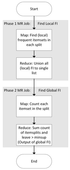 MRApriori [13] is different and presents a two-step algorithm. The first step is to divide into Splits (done by the MR framework) and run the classical Apriori on each Split inside the Mapper (it reads the whole input into the memory of the Mapper as one chunk) to find “locally” frequent itemsets. After that, the Reducer joins the results of all Mappers and they become candidates for final frequent itemsets (if the itemset is frequent in , then it must be frequent in at least one of its Splits). The second job/step is just counting of all candidates’ appearance in each Split and filtering only the frequent itemsets that pass the minimum support level. Figure 3 demonstrates the algorithm’s block diagram for clarification.