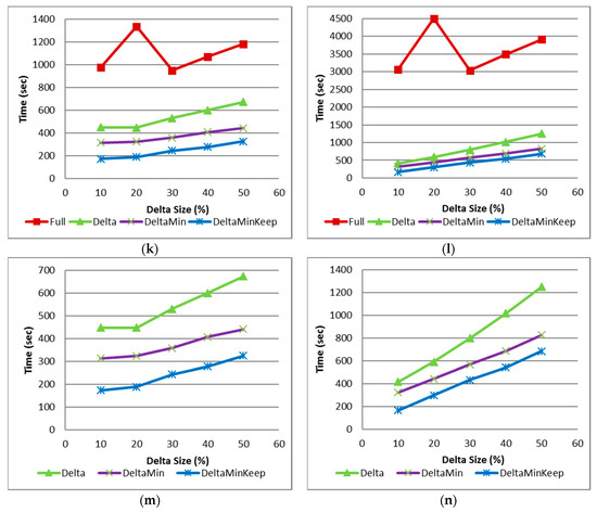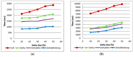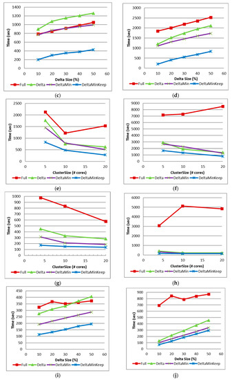 Figure 9c,d are similar to Figure 9a,b, but they depict the algorithm’s behavior for minSup 0.2%. In this case, the run time of “Delta” is higher than “Full” and “DeltaMin” behaves almost the same as “Full”. The CPU time of “Delta” and “DeltaMin” is still lower than that of “Full”. “DeltaMinKeep” is better by all parameters than “Full”. The large difference between “DeltaMinKeep” and “DeltaMin” is explained by eliminating the need to run the recount Job in old .