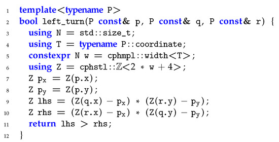 Let us consider how the left-turn orientation predicate can be coded in C++. The code for the right-turn, no-turn, and signed-area calculations is similar. Using the off-the-shelf tools available at the CPH MPL [21] and the CPH STL [22], the C++ code for computing the left-turn predicate is shown in Figure 1. If the width of the original coordinates is w bits, with (2w + 4)-bit intermediate precision we can be sure that no overflows happen—and the computed answer is correct. There are many other—more advanced—methods to make this computation robust (for a survey, we refer to [23]).