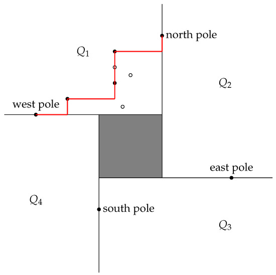 Let S be a multiset of points. Of these points, a point p dominates another point q in the north-east direction if and . Since the requirement is to be strictly larger in both x and y, then for a pair of points as and , we have that neither of them dominate the other in the north-east direction. A point p is dominant in the north-east direction if it is not dominated in this particular direction by any other point in S. That is, the first quadrant centred at p has no other point in it. Analogous definitions can be made for the south-east, south-west, and north-west directions. A point is said to be maximal among the points in S if it is dominant in one of the four directions. Clearly, every extreme point is maximal (for a proof, see [14]), but the opposite is not necessarily true.